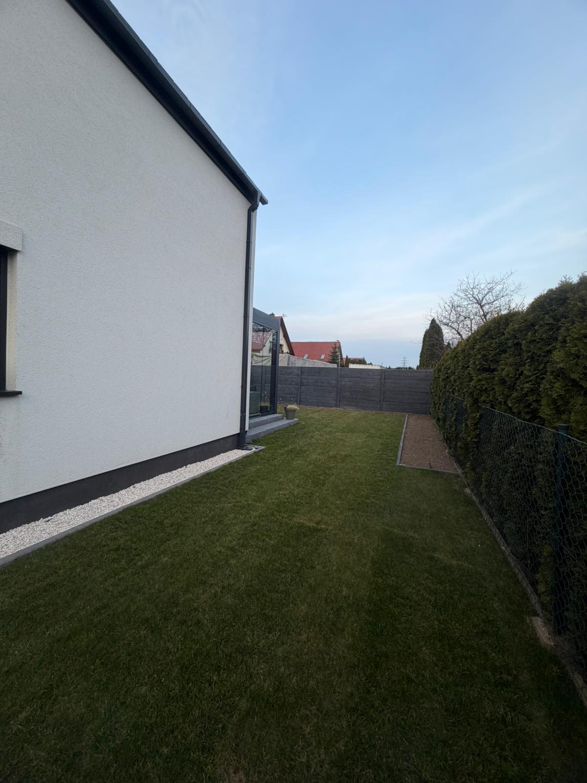 Szczególną uwagę poświęcono relacji domu z ogrodem – duże przeszklenia oraz zrealizowana, nowoczesna zabudowa tarasu tworzą płynne przejście między wnętrzem a przestrzenią zewnętrzną. Przeszklona strefa wypoczynkowa stanowi naturalne przedłużenie części dziennej, podnosząc komfort użytkowania niezależnie od pory roku.