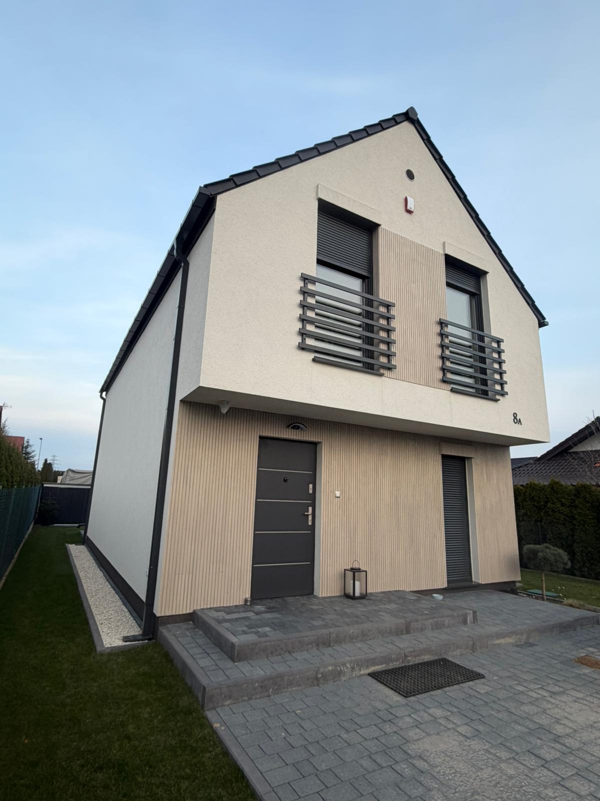 Minimalistyczna forma z dwuspadowym dachem została uzupełniona o subtelne akcenty materiałowe – zestawienie jasnej elewacji z pionowym deskowaniem oraz ciemną stolarką nadaje całości elegancki, wyważony charakter. Geometryczna bryła została dodatkowo podkreślona przez starannie zaprojektowaną strefę wejściową oraz uporządkowane zagospodarowanie terenu.